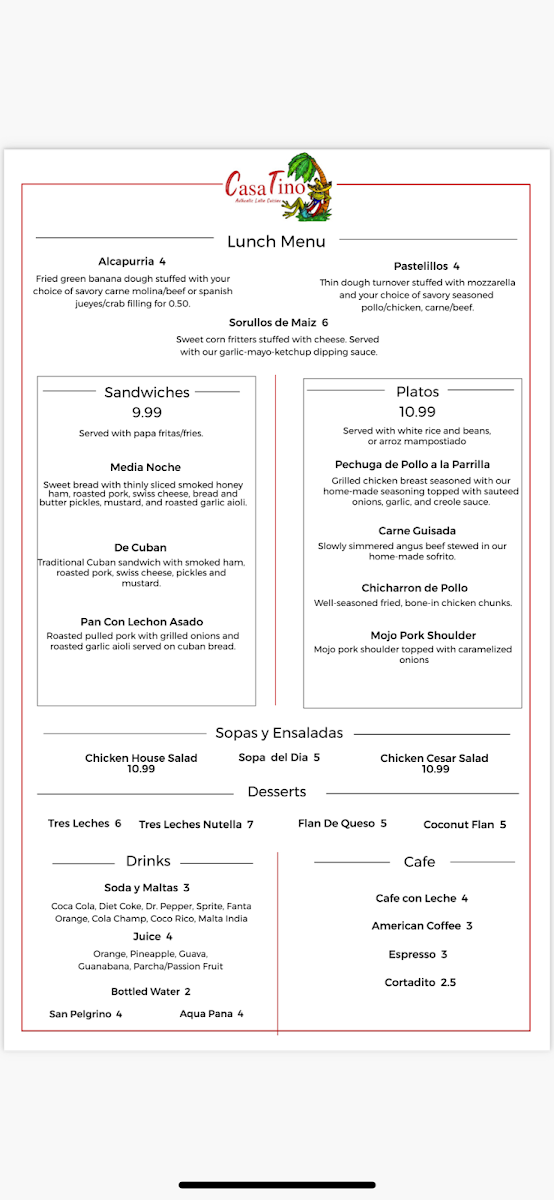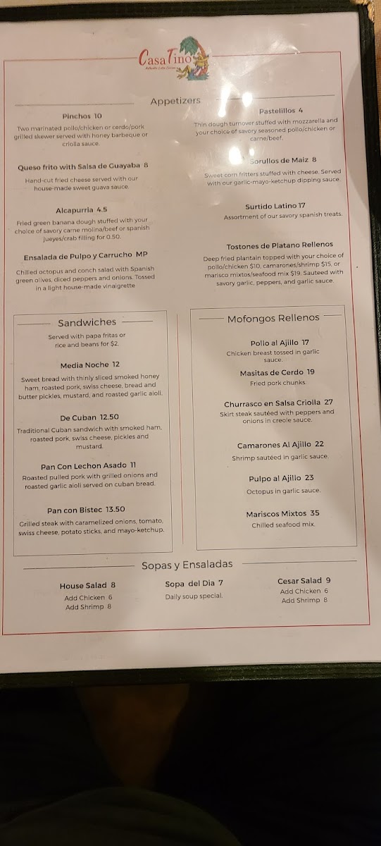 If you're in the mood for vibrant flavors and authentic dishes, Casa Tino Authentic Latin Cuisine Menu is the place to be. Located at 8742 State Road 70 E, Bradenton, FL, this restaurant offers a delightful array of traditional Latin dishes, each crafted to bring the true essence of Latin culture to your plate. From sizzling fajitas to savory empanadas, every bite is bursting with bold and fresh ingredients, perfectly seasoned to satisfy your cravings. Whether you're a fan of rich, hearty stews or light, flavorful ceviche, Casa Tino ensures a memorable dining experience. You can even indulge in their mouthwatering desserts like tres leches cake to wrap up your meal on a sweet note. The menu has something for everyone, making it the perfect spot for a family gathering or a night out with friends.